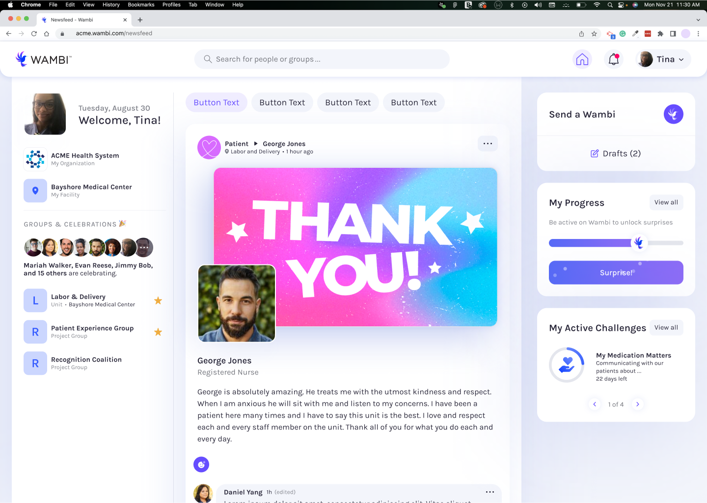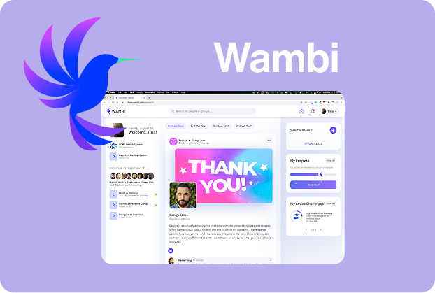 Wambi is an employee recognition platform reducing burnout in healthcare. I led research & testing. Designed for web and mobile in an agile startup remote setting.